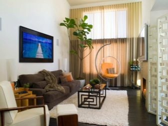 Много дизайнери също съветват да поставите дълги завеси в по -тъмен нюанс от мебелите в малка всекидневна. Можете да поставите диван близо до прозореца (бялото е най -подходящо) с декоративни възглавници.