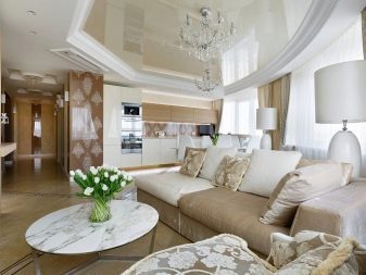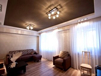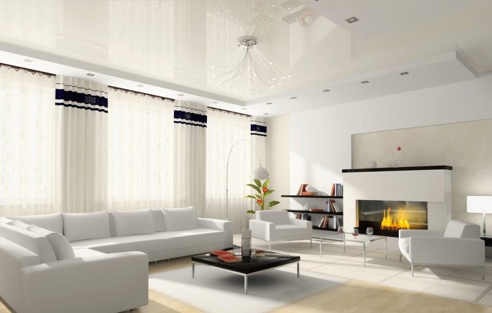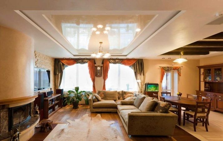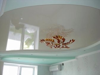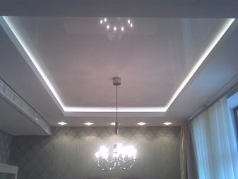 Таванът в апартамент може да бъде съвсем прост – правоъгълно бяло платно с второ ниво под формата на рамка, но ако е допълнено с оригинален полилей, то веднага променя впечатлението. В този случай осветителното устройство се превръща в акцент и се допълва от малки лампи по периметъра на рамката. Използва се и лъскава повърхност, която отразява светлината и визуално прави стаята по -просторна, което може да бъде полезно за малки пространства..