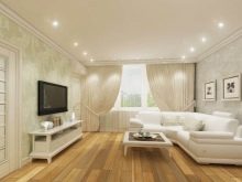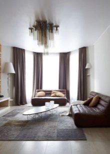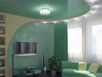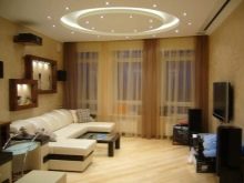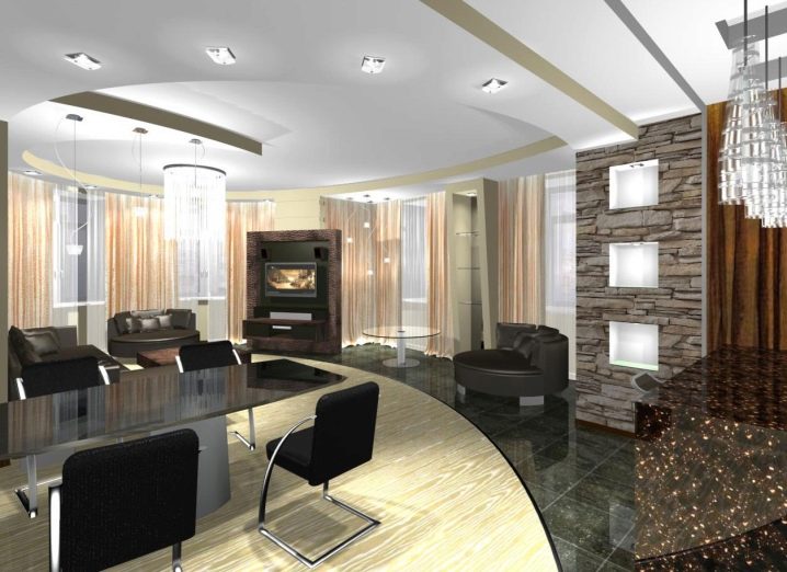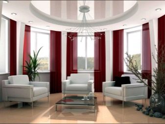 Залата с еркера изглежда красива, но създава известни трудности при довършителните работи. Гъвкавите профили и таваните от гипсокартон ви позволяват да придадете на платното всякаква форма. Ако желаете, можете по някакъв начин да победите присъствието на еркера, подчертавайки тази област, като използвате блокове на тавана.