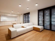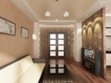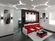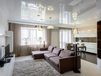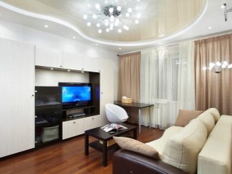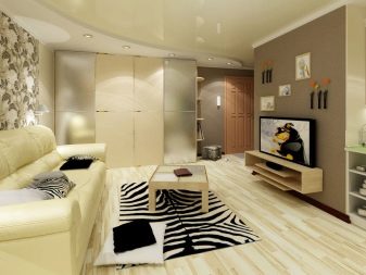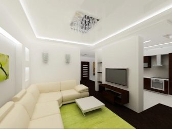 Малка стая за 18-16 кв. m може да бъде допълнен и с опънат таван. В същото време е важно да се избягват обемисти структури, които визуално изяждат място. По -добре да използвате лаконични блокове с геометрични форми – правоъгълни или заоблени.
