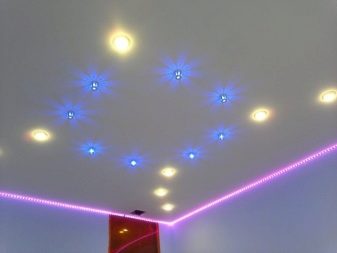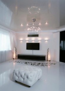 Точковите лампи създават оригинален ефект. Те могат да бъдат поставени по цялото едноетажно платно под формата на всяка композиция, това ще съживи лаконичния дизайн. Също така осветителните тела могат да бъдат поставени по границата на многостепенни тавани, на тези места, където блоковете са в непосредствена близост един до друг. Това не само ще подчертае дизайнерските характеристики, но и ще служи като средство за зониране на стаята..