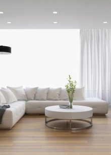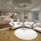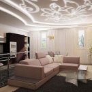 Слоевият дизайн може да бъде в един цвят, това е подходящо за занижени стилове на дизайн. Използват се точкови лампи, които създават интересен ефект поради подсветката. Можете също да комбинирате не цветове, а текстури – матови и лъскави, което изглежда оригинално, но в същото време таванът не се вълнува от различни цветове. В допълнение, правоъгълната рамка помага за зониране на пространството, подчертавайки линията, която съставляват фотьойлите и дивана..