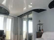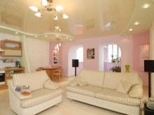 - таваните са многостепенни и едноетажни. Първият вариант изглежда по -впечатляващ, позволявайки ви да въплътите различни дизайнерски идеи, но е подходящ само за апартаменти с високи тавани. Ако височината е малка, тогава е по-добре да направите с платно на едно ниво, което ще изглежда добре и ще скрие недостатъците;