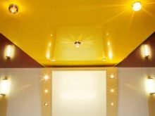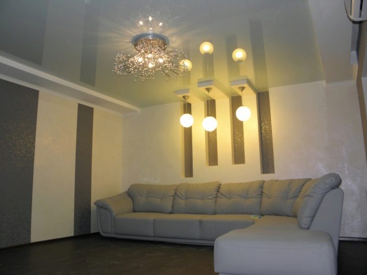 Материалът, от който са направени опънатите платна, се страхува от високи температури – тъй като се деформира, избледнява и се срутва под тяхно влияние, така че лампите трябва да са безопасни. Ако желаете, можете да използвате както голям полилей в центъра, така и много малки лампи, както и да ги комбинирате по различни начини. Основното е, че има достатъчно осветление, за да се създадат комфортни условия в хола..