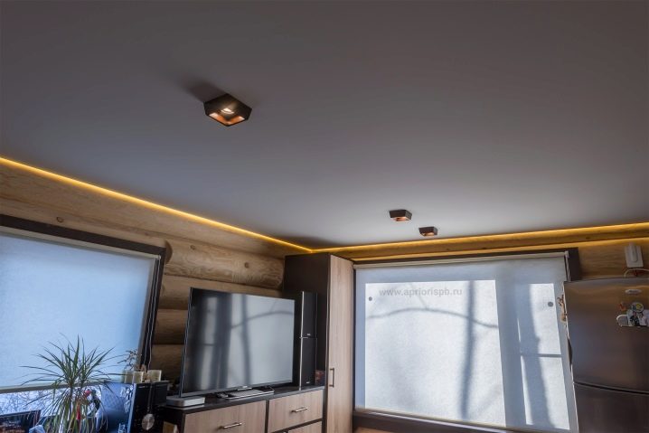 - Освен това таванът може да бъде украсен с осветление. Той изпълнява както декоративна функция, така и служи като допълнителен източник на светлина;