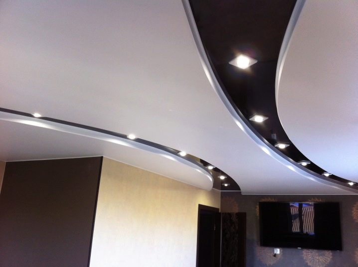 Черно -бялата комбинация е класика, която е в хармония с всякакви други нюанси, ето пример за такъв таван. Не изглежда скучно, тъй като слоевете образуват оригиналните дъги. Те се допълват от линия за осветяване на малки лампи.