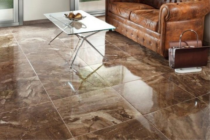 Луксозни плочки с мраморен ефект. На матриците се кичат петна в кафяви нюанси. Снимката показва как плочките се комбинират с кафяви мебели..