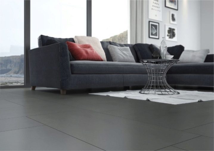 Строги сиви плочки. Практичен и стилен завършек за дневни с модерно докосване. Материалът има матова текстура.