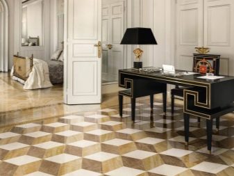 Този дизайн на пода може да се използва както в класически, така и в модерен стил. Всичко зависи от цвета на плочката и допълнителните елементи върху нея..