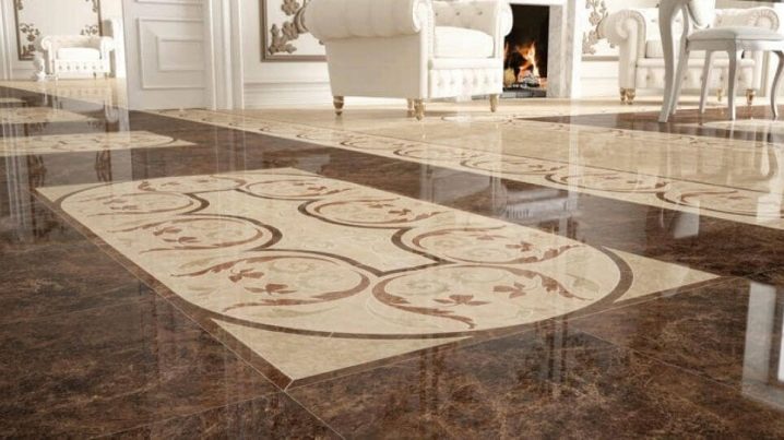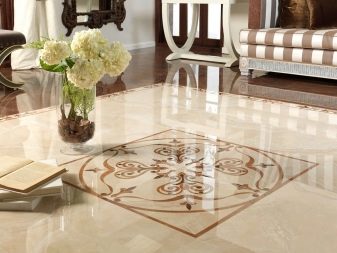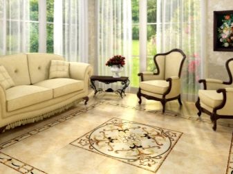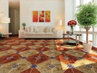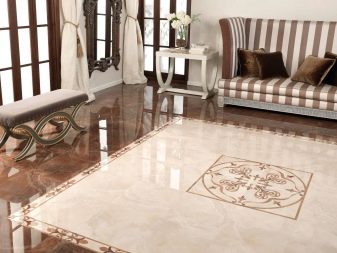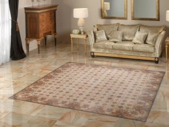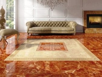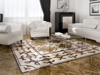 - Килим. Използвайки плочки на пода, те създават образ на килим. Част от шаблона се нанася върху всяка плоча, докато текстурата на довършителния материал е равна и гладка. Всяка плочка се поставя на пода в определена последователност, създавайки желания модел. Тази техника често се използва в класически декоративни посоки. Дизайнерите препоръчват използването на тази техника в просторни дневни..