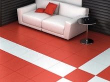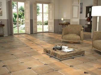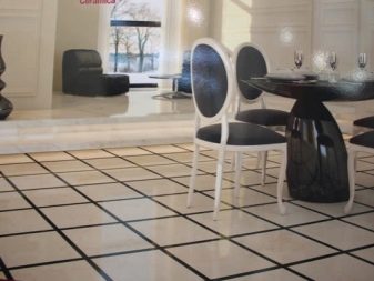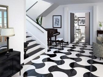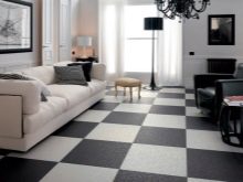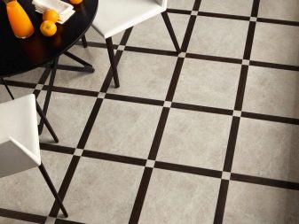 Този дизайн на пода може да се използва както в класически, така и в модерен стил. Всичко зависи от цвета на плочката и допълнителните елементи върху нея..