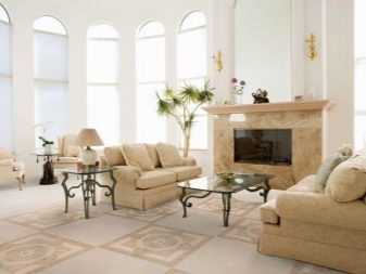 Килим от плочки. Популярен дизайнерски трик, който описахме по -горе в статията. Довършителният материал е в хармония с класическото обзавеждане (мебели, камина, декорация на стени, декоративни елементи).