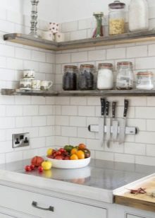 - В кухнята отворените рафтове се използват за демонстриране на скъп комплект, както и за подправки, които са необходими постоянно по време на готвене. Удобно, защото не е нужно постоянно да отваряте килера и да търсите подходящата чанта или буркан там, всичко е под ръка.