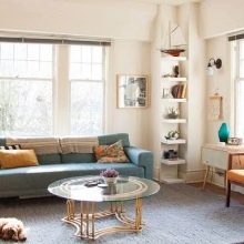 - Подобна стилна идея за декориране на стената зад дивана с рафтове.