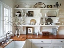 - В кухнята отворените рафтове се използват за демонстриране на скъп комплект, както и за подправки, които са необходими постоянно по време на готвене. Удобно, защото не е нужно постоянно да отваряте килера и да търсите подходящата чанта или буркан там, всичко е под ръка.