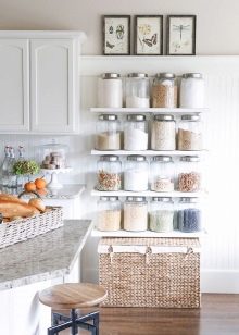 Същата опция може да се използва за практически нужди, например в кухнята или в банята.. Но правилото е същото – не бъркайте. В кухнята подредете различни масла в стъклени бутилки в същия стил. Или подправки в еднакви стъклени флакони. Редица зърнени култури изглеждат интересни в стъкло. Можете също така да украсите с готварски книги..