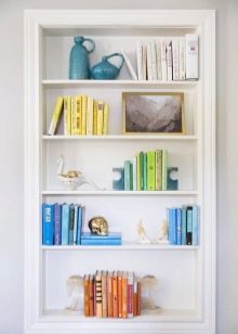 Когато декорирате рафтовете, използвайте цялата им площ, поставете предмети не само на височина, но и в дълбочина. Например купчина книги, последвана от месингов свещник или висока ваза. С други думи, използвайте предмети с различни форми и размери..