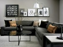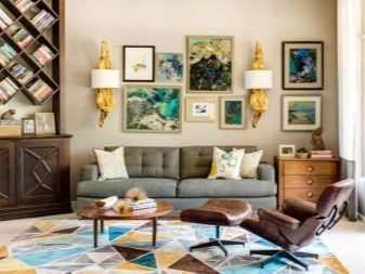 Рафтовете над дивана перфектно излагат картините, но не забравяйте да поставите няколко платна, по -добре е те да са с различни размери. Същият подход се отнася и за личните снимки. Украсете ги в рамки с различни размери с рогозка. Единият стил на декоративните елементи добавя естетика и стил в пространството.