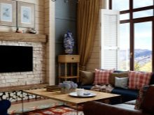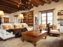 За декориране на повърхностите на пода, стените и тавана на хола в селски стил се използват естествени материали – дърво, тухли, камък. Когато покривате пода с изкуствени материали, трябва да изберете тези, които имитират естествени, например дърво..