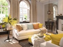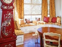 Също така ще бъде логично и удобно да се организира място за сядане или лежане вместо перваза на прозореца. Тогава завесите, рамкиращи прозореца, разбира се, трябва да подчертаят този интересен детайл от интериора..