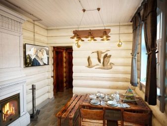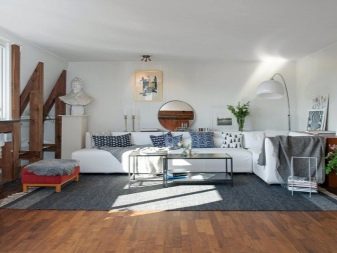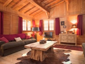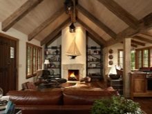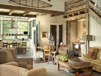 В градски апартамент първоначално всички самолети са плоски. Ако желаете, можете да добавите груби структури към интериора: осигурете допълнителни дървени стълбове и греди, които не носят товара, но играе ролята на основа за окачване на лампи или поставяне на други елементи.