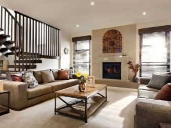 Може дори да има комбинация от различни тапицерии, например диван в един тъмен цвят и фотьойл в друг. Възможно е да се използва едно парче мека мебел в ярък цвят, който има аналози в естествени материали. Това може да бъде тухлен нюанс на едно кресло, за да добавите ярък акцент към сдържаната гама на интериора..