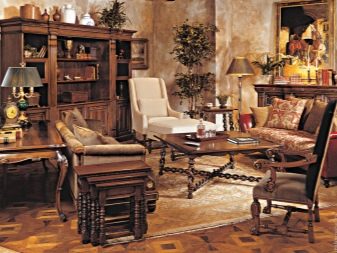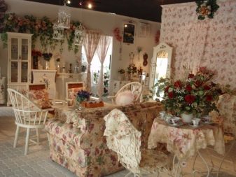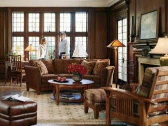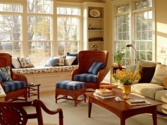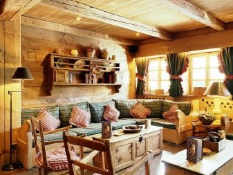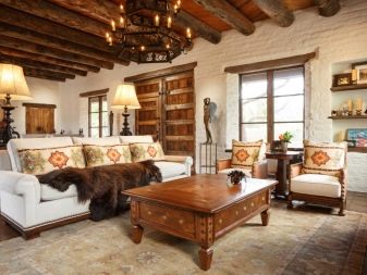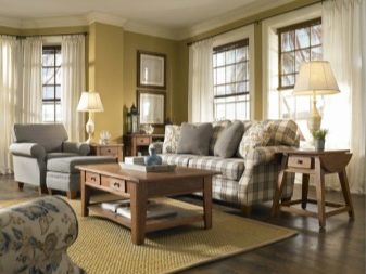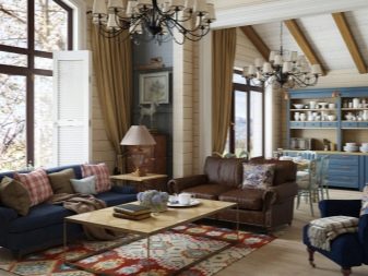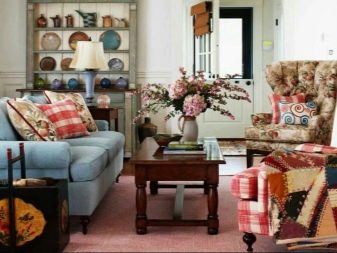 Селският живот предполага простота и функционалност на предметите, следователно мебелите за такива помещения трябва да са с проста форма, завършени с естествени или имитиращи естествени материали: дърво, кожа, тъкани, възглавници и плетени одеяла.