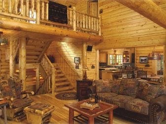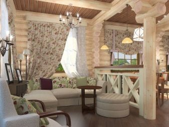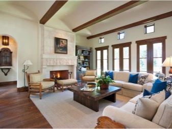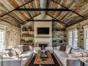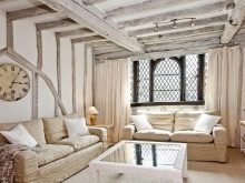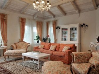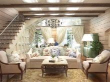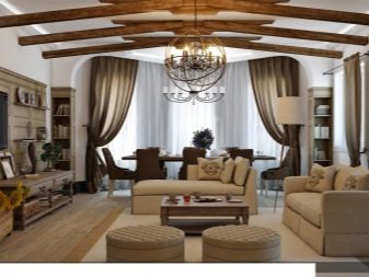 Когато създавате интериора на зала в селски стил в частна къща, не е необходимо да затваряте структурата на стаята. Дървените греди на тавана и стелажите ще създадат определен чар, ако ги боядисате в естествения цвят на дървото или ги лакирате, а между тях оставите варовик или тапет..