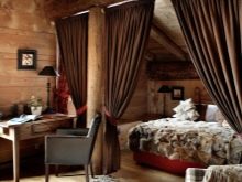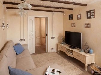 Ако говорим за малка стая в апартамент, тогава има много по -малко възможности за използване на естествени материали. Но след като демонстрира доля въображение, вградените мебели могат да бъдат създадени от естествено дърво, покрито с прозрачен лак, за да се запази цвета. Такива елементи веднага определят стила на страната и остава само да вземем всички останали елементи за тях, без да нарушаваме единството на интериора..