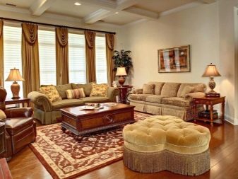 Килимите изглеждат добре на пода. В зависимост от дизайна, те могат да имитират животински кожи, полуантични флорални цветове, едноцветни или близки до едноцветни, в малко цвете. В същото време кожите действат като акцент на интериора, а едноцветните и почти едноцветни създават фона на стаята. Антични килими, с малък флорален принт, повтарящи цветовете на мека мебел, обединяват група дивани и фотьойли, групирайки пространство за комуникация.