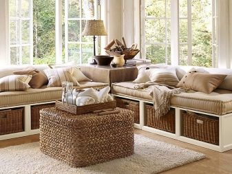 Също така, не противоречете на стила на страната и плетени кутии за съхранение на всякакви дреболии. Те могат да присъстват както като част от обзавеждането, така и като независими нощни шкафчета. Всички малки неща, присъщи на стари къщи и имоти, могат да бъдат подходящи като декорация на хол в селски стил.