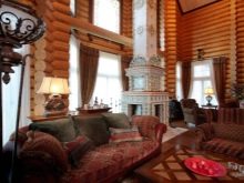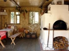 И дори версия на руска хижа с голяма печка, дървени трупи и плочки.
