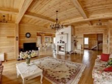 Всекидневната в дървена къща трябва да бъде направена в селски стил. Необходимо е да го оборудвате с просто обзавеждане, без прекомерна претенциозност..