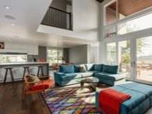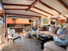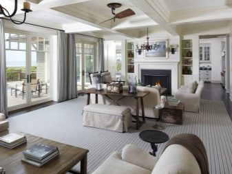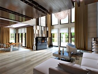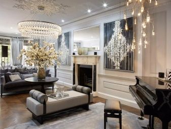 - стилът се характеризира с използването на подиуми и различни издигания, например, една или две стъпала, което добре подчертава зонирането на пространството на голяма стая;