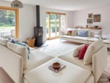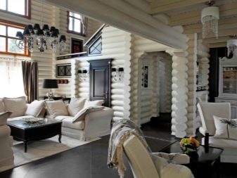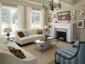 - Дневните от дървен материал в рамка или дървена къща не могат да имат класически интериор. За декорация е по -подходящ селски стил. Проектите на такива къщи са доста често срещани и са популярни при строителството на вили..