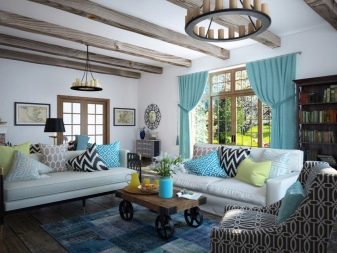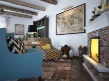 Материалите обикновено се избират естествени и естествени, съчетани с културата на избраната страна. Всички останали детайли ще бъдат избрани по същия начин: килими, лампи, тип мебели и нейната тапицерия. Например всичко в хижата трябва да бъде хармонично..