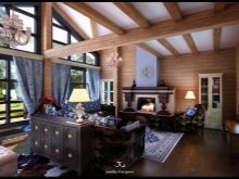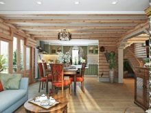 Всекидневната в дървена къща трябва да бъде направена в селски стил. Необходимо е да го оборудвате с просто обзавеждане, без прекомерна претенциозност..