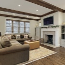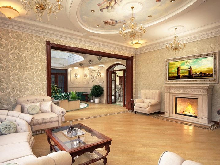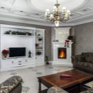 - Класиката изисква довършване с естествени материали. Те включват дърво, камък, памучни тъкани, кожа, кожи, вълнени и ленени изделия. Широко се използват различни ръчно изработени дизайнерски аксесоари; тавани на две нива, големи прозорци, масивни огледала, картини. Обмисля се решение за осветление, възможно е да се раздели на различни зони, благодарение на поставянето на голям брой подови лампи, лампи, полилеи, дори свещи. Избират се меки, спокойни нюанси на цвета. често наличието на издълбани шарки и мазилки. В декорацията на камината доминира естествен камък, мрамор.