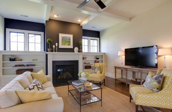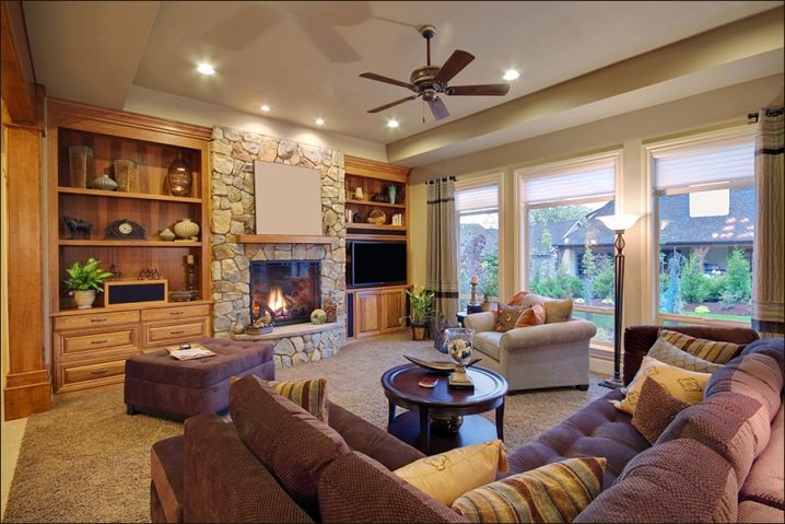 Най -оптималният начин да подредите тези елементи е да ги инсталирате на различни стени, перпендикулярни една на друга или на една и съща линия. Диванът и фотьойлите се поставят пред телевизора или в кръг до камината, ако пространството позволява. Тогава домакинството ще може да избере място според предпочитанията си..