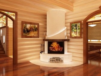 Дървена камина ще се впише добре в хол, където има паркет, ламиниран паркет, подходящи мебели. За да придаде на стаята жар, стената с камина е украсена с нюанси на цвят, контрастиращи с основния фон, избират се довършителни материали с различна текстура.