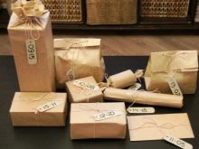 - Viime aikoina tavallisista, merkkituotteista valmistetuista valmiista lahjapusseista on tullut suosittuja. Niitä on erikokoisia ja ne on erittäin helppo sisustaa. Voit koristella pinnan sopivan kokoisella ikebanalla, joka on valmistettu oksista, palloista ja nauhoista, voit levittää jonkinlaista kuviota tai koristaa pussin luonnollisista kankaista valmistetuilla nauhoilla.