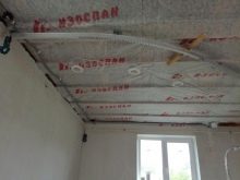 - Когато изолирате подове на мазето, изоспан се закрепва отдолу. За това най -често се използва строителен телбод, но вместо него е допустимо да се използват дървени летви..