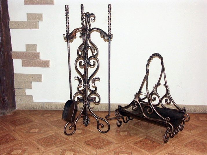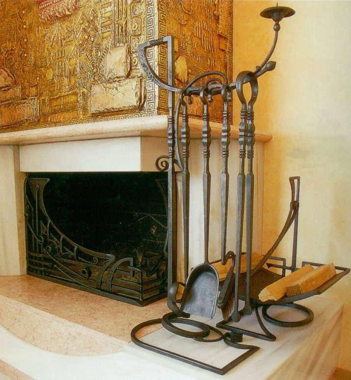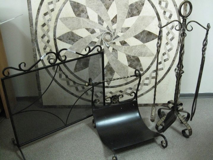 Всички аксесоари за камината са изработени от материали с висока огнеустойчивост. Това са различни метални сплави, както и термоустойчиво стъкло. За допълнителна защита те са покрити със защитен слой от специален разтвор. По този начин наличните инструменти стават по -издръжливи..