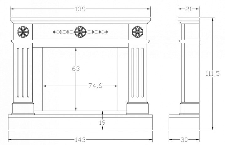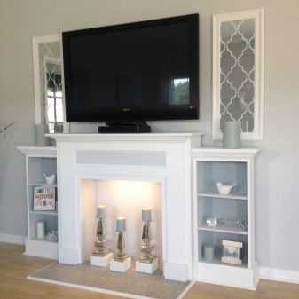 В горната част на камината може да се монтира декоративен рафт, в горивната камера да се монтира електрическа камина или телевизор.