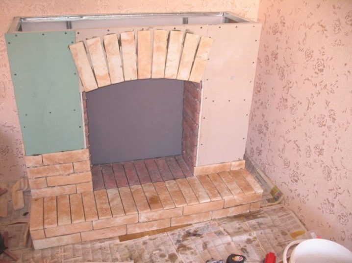 Ако камината е завършена с изкуствен камък или мрамор, тогава довършителните работи под формата на шпакловка могат да бъдат пропуснати. В този случай просто трябва да грундирате гипсокартона и след това да залепите камъка със специално лепило. Оставете лепилото да изсъхне добре и обработете всички шевове между камъка със специална фугираща смес.