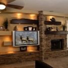- Декоративна камина, завършена с камък, е идеална за стая в селски стил.