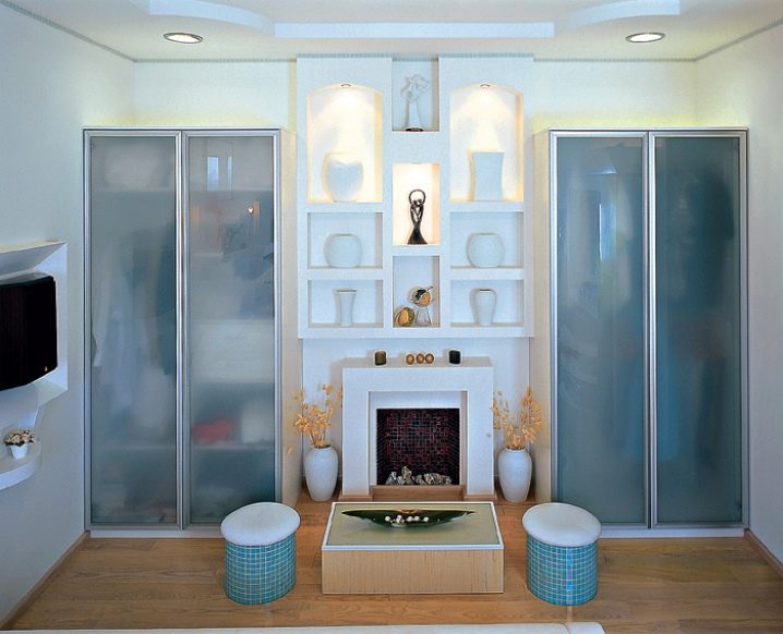 Тази камина е “декоративна”. Той няма да може да го стопли физически, но е в състояние да задоволи психически, тъй като такава печка изглежда много елегантна, необичайна и развеселява. Декоративните камини от гипсокартон са много по -лесни за изработка и монтаж от металните. Тук няма повече технически моменти, а повече креативност, въображение и креативност. Този дизайн ви позволява да трансформирате всякакви дизайнерски идеи и творчески импулси в живота..