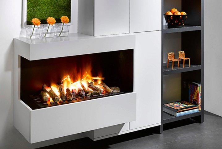 Окачените модели електрически камини изглеждат оригинални във високотехнологичен интериор.