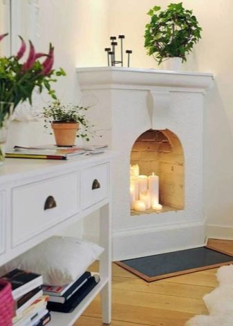 За условна имитация на камина са необходими само декоративни материали. Порталът на такава камина може да има малък отстъп от стената и да има място за огнището. Невъзможно е да запалите такава камина, но можете да поставите свещи в горивната камера или просто да поставите дървата за огрев красиво..