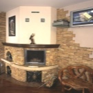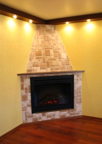 Малко по -практичен вариант с боядисване. Тук обаче има няколко възможности и не можете да направите камина с такъв декор специална.. Можете да изберете по -скъп и по -надежден вариант: изкуствен камък или керамични плочки. С помощта на тези материали ще бъде трудно да се разграничи ъгловата фалшива камина от истинската..